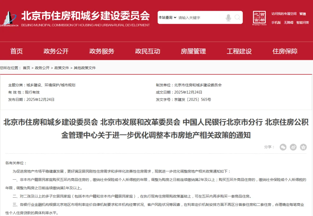 原标题:好消息!北京市公布新的房地产市场政策 据北京市住房和城乡建设委员会消息,12月24日,北京市住房和城乡建设委员会、市发展和改革委员会、中国人民银行北京市分行、北京市住房公积金管理中心四部门联合发布了《关于进一步优化调整本市房地产相关政策的通知》(以下简称《通知》)。 《通知》明确,进一步优化调整住房限购政策,更好满足居民严格住房条件和多样化改善住房需求。首先是为了方便非北京居民购房条件。外地家庭购买五环路商品住房的社保或个人纳税期限由现行的三年缩短为两年。对于北京以外的家庭购买五环商品房,目前的“两年”将缩减为“一年”。二是支持多子女家庭的住房需求。拥有两个或以上孩子的多子女家庭可以在五环内额外购买一套商务用房。这意味着,一个在北京有几个孩子的家庭可以在五环内购买三套商品房。外地多子女家庭,在北京连续两年缴纳个人社保税,可在五环内购买两套商品房。 《通知》明确,为进一步优化个人信贷政策住房、银行金融机构将根据本市市场利率制定自律机制的要求,结合金融机构经营状况、客户风险状况等因素,在利率制定机制安排中,合理确定每笔商业性个人住房抵押贷款的具体利率水平。有关抵押贷款相关服务的具体查询,请联系您的银行。 《通知》指出,公积金将加大对住房消费的支持力度,调整第二套公积金贷款最低首付比例。对贷款申请人(含联名申请人)使用公积金个人住房贷款购买第二套的,最低首付比例由30%以上调整为25%以上。 《通知》还进一步优化业务为提高投资效率,建议将土地招标拍卖设立房地产开发项目的方式由市级审批调整为区级申报。