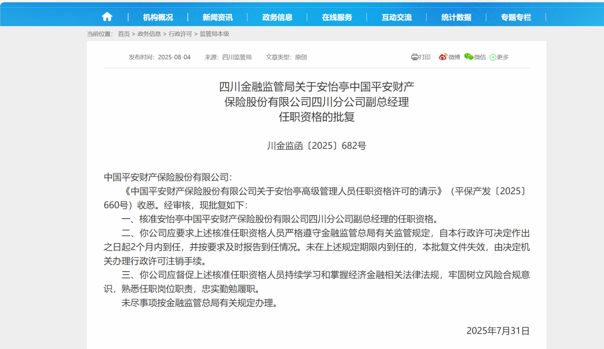 每日更新中国Ping Property Insurance Sichuan资格获得该分支机构的评级已批准 由admin打开2025年8月6日2025年8月6日对“中国Ping Property Insurance Sichuan资格获得该分支机构的评级已批准”作出评论 8月4日,四川金融监管局发布了“承认财产保险有限公司四川分行副总经理的资格”。 (Chuanjin Jianhan [2025] No. 682),任何中国Ping A Property Insurance Co.,Ltd.