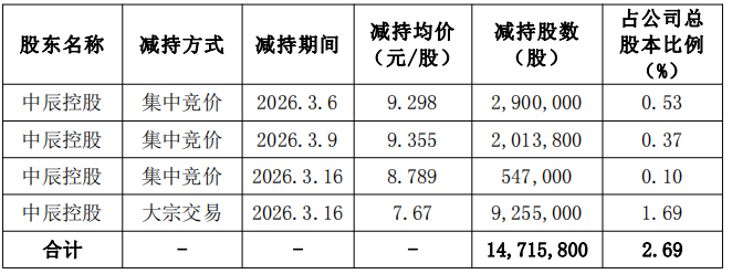 中国经济网北京3月18日电 中辰股份(300933.SZ)昨日下午发布公告称,控股股东权益变动已达到1%的整数倍,减持计划已实施完毕。公司表示,于2025年11月25日披露了《关于大股东减持股份的提前披露公告》(公告编号:2025-108)。陈控股拟通过集中竞价或大宗交易方式减持公司股份16,412,713股以上(占公司总股本的3.00%)。减持期限为预披露公告之日起15个工作日内(即2025年12月17日至2026年3月16日)三个月内。其中,若集中竞价减持,拟于公告/披露之日起15个工作日后3个月内进行,合计减持数量连续90日内减持的股份数量不超过公司总股本的1%。以大宗交易方式减持股份的,将在公告披露之日起15个工作日和三个月内实施,且连续90日内减持股份总数不超过公司总股本的2%。 2026年3月10日,公司发布了《关于控股股东权益变动为5%完整倍数的情况下,披露简易股本变动报告书的公告》(公告编号:2026-015)。公司大股东中辰控股通过可转债转股被动稀释自身,并通过集中竞价主动减持。至此,公司总股本为21,883.62万股,占股东权益的40.00%,股票波动率为5%的整数倍。公司近期收到中达控股《关于中达持股比例变更为1%整数倍并终止减持计划的通知》。据透露,中辰控股持有公司股份减少至20,903.42万股,占总股本的38.21%,持股比例为1%的整数倍。本次减持计划实施以来(2026年3月6日至2026年3月16日),中辰控股通过集中竞价操作、大宗操作等方式,累计减持1,471.58万股,相当于公司总股本的2.69%。平均减持价为7.67元/股至9.355元/股。本次减持计划期限已满,本次减持计划实施完毕。按照降价期间均价计算,中城控股因本次降价套现金额约为1.22亿n元。中辰控股表示,此次股份变动是由于公司大股东中辰控股实施了此前披露的减持计划。本次换股后,中辰控股持有公司股份减少至209,034,200股,占公司总股本的38.21%,换股比例达到1%的整数倍。本次换股不涉及要约收购,不会导致公司控股股东或实际控制人发生变化,不会影响公司治理结构和持续经营。中辰股份于2021年1月22日在深圳证券交易所创业板上市,发行代码9170.00。股份数量为10,000股,发行价格为3.37元/股,保荐人为海通证券股份有限公司(现为国泰海通证券股份有限公司),保荐代表人为张辉波先生、刘丹先生。中诚股份上市募集资金总额为3.09亿元。扣除发行费用后,融资净额为2.57亿元。最终,中辰筹集的资金比原计划少了1.83亿元。据中诚股份2021年1月15日披露的招股书显示,公司拟募集资金4.4亿元,其中1.43亿元用于建设项目d.e环保轨道交通特种电缆、7366万元用于新能源特种电缆建设项目、2320万元用于高端电缆及装备研发中心建设项目、2亿元用于劳动力补充。首都。中诚股份上市发行费用为5,155.17万元,其中保荐及认购费用为3,301.89万元。根据《202年半年度募集资金存放及使用情况专项报告》根据中国证监会《关于中辰线材股份有限公司发行不特定对象可转换公司债券登记的批复》(证监许可[2022]678号),公司发行可转换公司债券5,705,370张,本次发行不明确,发行价格为每张债券的面值。按面值发行100元,发行总额公司募集资金为人民币 755.66 元,扣除未缴纳的赞助费和认购费 6,053 元(不含增值税)后的余额 564,483,244.34 元,存入苏州银行宜兴支行银行账号 51287500001158。其他发行费用扣除前期募集资金8,776,894.20元(不含增值税)后,截至2022年6月7日,信永中和会计师事务所(专项公司)确认收到本次募集资金净额为561,760,105.80元。公司本次募集资金及发行编号。中辰股份前两轮募集资金总额为8.8亿元。