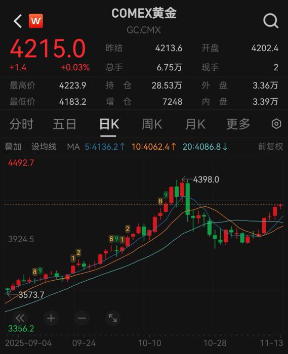 中国新闻网11月13日电(记者左雨晴)经历价格巨大震荡后,黄金出现“四连涨”。当地时间11月12日,国际金价连续第四个交易日上涨。恢复至 4,100 美元两天后,又回升至 4,200 美元上方。 COMEX 期金上涨 2.07% 至每盎司 4,201.4 美元。伦敦现货金突破4200美元关口后回落,上涨1.68%,收于4194.605美元/盎司。 11月13日,国际金价盘中再度震荡。截至下午 3 点,价格仍超过 4,200 美元。 COMEX 黄金重回 4,200 美元上方。受疫情影响,国内多家黄金零售商13日调整黄金首饰价格国际黄金价格。周太福、周大三的纯金首饰价格由前一日的1313元/克上涨至1333元/克,每克价格一夜上涨20元。周三三纯金饰品价格由前一日每克1309元上涨至每克1326元,一夜之间每克价格上涨17元。据路透社报道,在众议院投票重新开放政府之前,美国债券收益率下跌。与此同时,一旦“政府关门”结束,美国政府可能恢复公布经济数据,增加了美联储12月降息的预期。报告称,美国政府为期42天的“关门”给经济带来压力,导致政府统计数据中断,导致政策制定者和市场依赖私人指标来衡量经济状况。美国自动数据处理公司(ADP)公布的数据显示,美国劳动力市场依然低迷。此外,乌克兰暂停与俄罗斯谈判也增加了地缘政治风险。中国贸易商联盟首席研究员董希淼对记者表示,短期回调将导致金价长期上涨。他表示,情况没有变化,黄金的避险属性仍然强劲。 “货币宽松的大趋势仍在延续。市场预计美联储今年将再降息25个基点。实际利率下降将继续支撑黄金配置的价值。全球央行购买黄金的热潮并未减弱。从2022年起,年均净购买量将达到1000吨,远高于此前平均水平,成为黄金需求的稳定支柱。全球仍存在很大的不确定性,投资者需求依然强劲。” “资产依然强劲,这些因素应该会支撑金价,”他表示。金价波动将在高位加剧。投资者应密切关注市场变化,根据自身风险偏好和投资需求,在资产配置中合理配置黄金及相关产品,理性管理投资仓位,不盲目追涨杀跌。记者注意到,近期部分国家银行调整了存款业务。 11月11日,中信银行发布公告称,为适应市场情况变化,2020年起,定期储蓄计划最低固定投资金额由1000元调整为1500元,自2020年11月15日起,定期储蓄计划最低固定投资权重不变,最低存款金额仍为1克。中国建设银行宣布推出个人黄金储蓄业务产品并调整交易规则。同日,中国建设银行发布公告称,调整个人积金业务的产品介绍和交易规则,主要涉及汇率和大额退款。新版文本将于2025年11月15日正式发布。关于退款,修改后的规定规定,所有客户单日累计净退款请求(含售汇)超过上一营业日建行累计余额总额20%的,视为大额退款。若赎回金额较大,中国建设银行保留不接受超额赎回请求(包括赎回销售)的权利。此外,中国建设银行保留根据市场风险、流动性状况等情况调整巨额还款利率的权利。调整前将在中国建设银行官网公告。如果发生大额退款连续两个工作日(含结售汇)的,建设银行将在下一工作日进行退款交易(结售汇),并有权不迟于停牌之日通过建设银行官方网站等渠道进行公告。董小苗表示,投资者应了解流动性新规,特别是“大额赎回”条件,警惕极端市场条件下赎回请求可能被延迟或部分拒绝的情况,妥善做好流动性管理。同时,您可以使用规则来优化您的体验。更长的交易时间和限价单有效期让投资者拥有更大的灵活性。 (完)